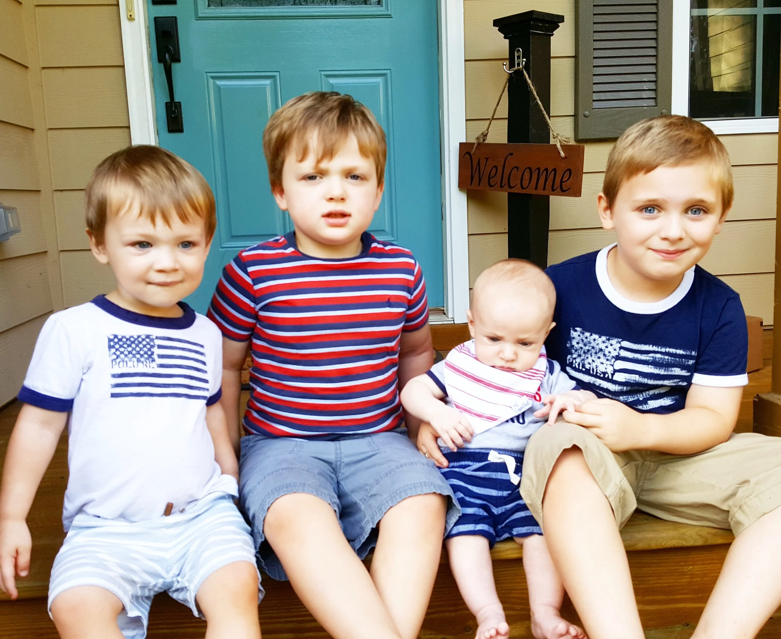 After herding the cats that I adoringly call my 4 sons, I arranged them on the front steps of my porch and began the ridiculous song and dance I do to desperately try for the unicorn, aka picture where all 4 boys are looking and smiling. Knox (age 4) was doing his normal look everywhere BUT the camera and Grey (age 5) was taking his job of carefully supporting Nash (his 4 month old baby brother) so seriously that he looked more concerned than happy. Jude (age 2), well he is also a determined child... and he was determined to make my perfectly envisioned photo op impossible. I would have everyone looking perfectly, sitting tall and he would make a run for the door... or pet the cement bulldog... or climb on a porch rocker. After several attempts I found myself wanting to yell... I may have let a harsh tone squeak out... then I plopped his bottom back into position with a little more gusto and there it flew.... down his leg, up his back.... POO! Knox was appalled, Grey was terrified of contracting pink eye (don't ask), Jude was intrigued! His hand was reaching for it... NOOOOOO! Outfit ruined, coordination thwarted, picture sabotaged, composure lost. I was sweating so much during the process, thank you GA humidity, that I had to clean myself up too. Why can't they appreciate the seriousness with which I take my role as family historian!?
